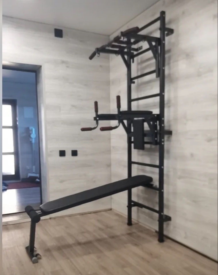 Брусья+пресс - универсальный снаряд для домашних шведских стенок, на котором можно выполнять отжимания на брусьях и упражнения на пресс (подъём ног)