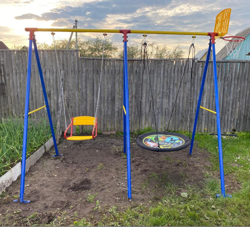 Качели в комплекте оснащены стойками и выполнены в яркой цветовой гамме: синий, желтый, красный. Материал изготовления - стальная труба диаметром 42 мм, что гарантирует надежность и долговечность конструкции.