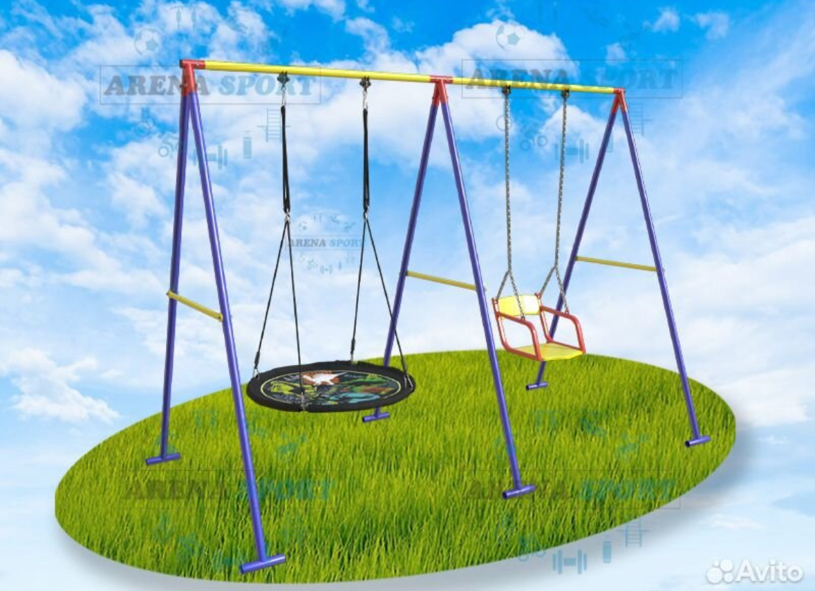 Качели в комплекте оснащены стойками и выполнены в яркой цветовой гамме: синий, желтый, красный. Материал изготовления - стальная труба диаметром 42 мм, что гарантирует надежность и долговечность конструкции.