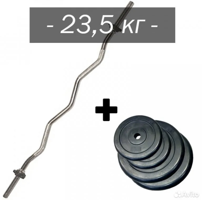 | Состав: | 2 диска [5кг], 2 диска [2,5кг], 2 диска [1,25кг], гриф W слабоизогнутый |